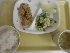 鶏肉をしょうが・にんにく・酒・コンソメで下味を付け片栗粉をまぶして焼き、ウスターソースと砂糖を合わせたソースにくぐらせ、焼いたパン粉をまぶしました。