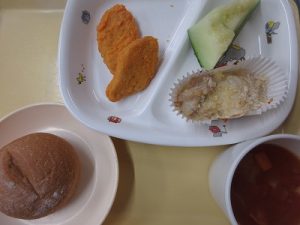 茹でたマカロニ・たまねぎ・しめじと・炒めた鶏肉とホワイトソースと合わせ、チーズ・パン粉・粉チーズをかけて焼き上げました。