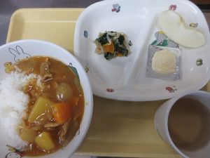 豚肉を酒・しょうがで下味を付け、じゃがいも・にんじん・玉ねぎを加えて炒め、カレールウ・中濃ソース・コンソメ・ケチャップで味を整えました。