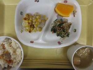 鶏肉・ごぼう・にんじんをしょうゆ・和風だし・みりんで炒め、ごはんと混ぜ合わせました。