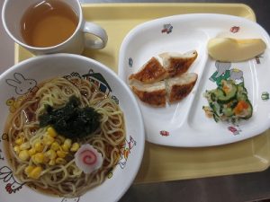 2025年10月10日 / 最終更新日 : 2025年10月10日 asunaro-user 今日の給食 2025/10/09の給食 <しょうゆラーメン> 醤油ラーメンにコーン・なると・わかめ・ネギをトッピングしました。 <ぎょうざ> <きゅうりの浅漬け> 蒸したきゅうり・にんじん・切干大根を浅漬けの素で漬けました。 <麦茶> <果物> りんごです。