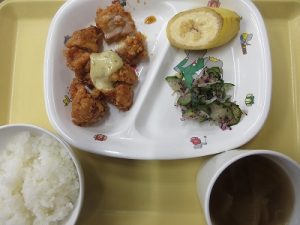 鶏肉を酒・しょうが・にんにくで下味を付け片栗粉をまぶして油で揚げる。しょう油・酢・みりんを合わせた甘酸っぱいソースを絡め、タルタルソースをかけました。