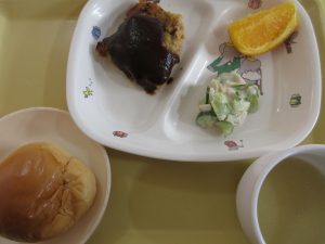 豚ひき肉・塩・人参・オニオンソテー・豆腐・パン粉をこねて焼き上げました。その上にデミグラスソースをかけました。