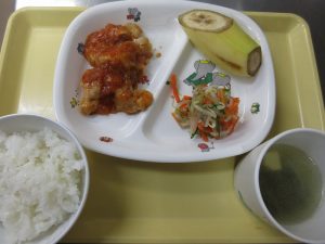 鶏肉を酒・しょうが・にんにくで下味をつけ片栗粉をまぶして焼き、ねぎ・たまねぎ・チリソース・砂糖・ケチャップを合わせたソースと絡めました。