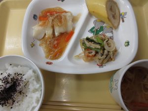 カレイを焼き上げ、玉ねぎ・にんじん・えのきを炒めしょうゆ・みりん・和風だしで味付けをした和風あんをかけました。