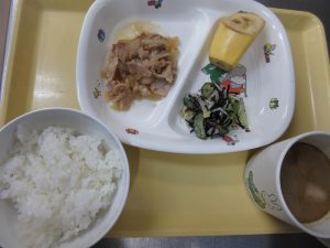 豚肉を酒・しょうがで下味をつけて玉ねぎを加えて炒め、しょうゆ・砂糖・酒・みりんで味を整えました。