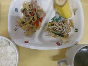 豚肉をしょうが・酒で下味を付け、炒めたキャベツ・にんじん・もやしと最後にニラを加えて、鶏がらだし・中華だし・しょうゆで味を整えました。