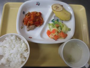 鶏肉を酒・しょうが・にんにくで下味を付けて焼き、たまねぎ・しめじを炒めてダイストマト・ケチャップを加えコンソメ・砂糖で味を整えたソースにかけました。