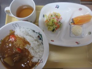 豚肉を酒・しょうがで下味をつけ、たまねぎ、にんじん、じゃがいもを加えて炒めカレールウ・コンソメ・中濃ソースで味を整えました。