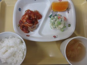 鶏肉に酒・にんにくコンソメで下味をつけ、たまねぎ・しめじ・トマトダイス缶をケチャップ・コンソメ・砂糖で味付けしたトマトソースをかけました。